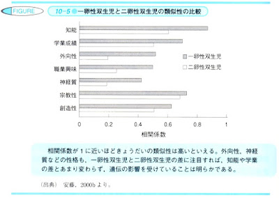 この表からも明白なように、人格における諸因子の相関は、明らかに一卵性双生児の方が高くなっていることがわかります