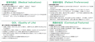 「医学的適応」「患者の意向」「QOL」「周囲の状況」の4項目の検討を行います。