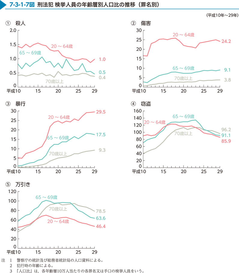 総数における高齢者の刑法犯検挙人員の人口比は1998年以降、65~69歳の者では2006年まで、70歳以上の者では2007年まで、それぞれ上昇し、それ以後は、65~69歳の者では緩やかに低下し、70歳以上の者ではおおむね横ばいであり、高齢者の検挙人員が2006~2007年頃までは、これらの年齢層の人口の増加を上回る勢いで増加していたことが読み取れます。