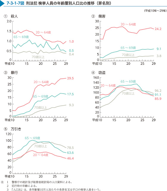 20歳~64歳が85.9であるのに対し、65歳~69歳で91.1であり、70歳状になると96.2に達しています(ちなみに数字は、各年齢層10万人当たりの検挙人数です)。