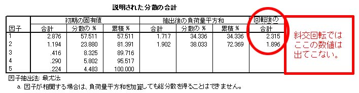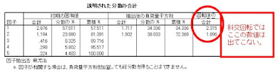 - 因子パタン行列:直交回転における因子負荷に該当する。「回転後の負荷量平方和」欄に「合計」しか出力されない。