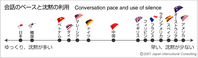 左の方に行くほど、沈黙を重んじ、会話のペースがゆったりとした文化になります。